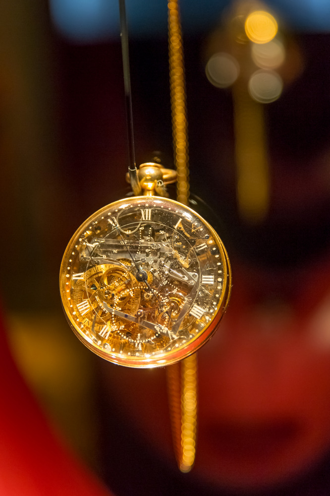 Even by the standards of the day it was an astronomically expensive piece. The most valuable materials (including gold, platinum, rubies and sapphires) were used with no limit placed on time or cost. The watch is encased in gold, with a clear face that shows the complicated movement of the gears inside. Breguet used sapphires in the mechanism to decrease friction.