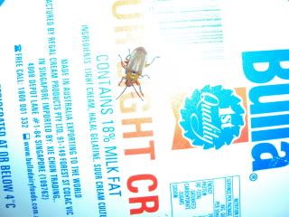 okay veg, on your Control Button, the round jobby that you press with your right thumb, you should see a little flower at the 9 O’clock setting. If you hit the little flower setting once you will get to Auto-Macro, the camera will decide whether to macro or not, but if you hit the flower setting twice you will set the Macro to On, and your camera will focus on up close thingos. It may take one or two attempts to focus on the bug, but you’ll get the hang of it. Put the bug on something plain, like material or paper, not the milk carton because the camera is lazy and will want to focus on the text instead.