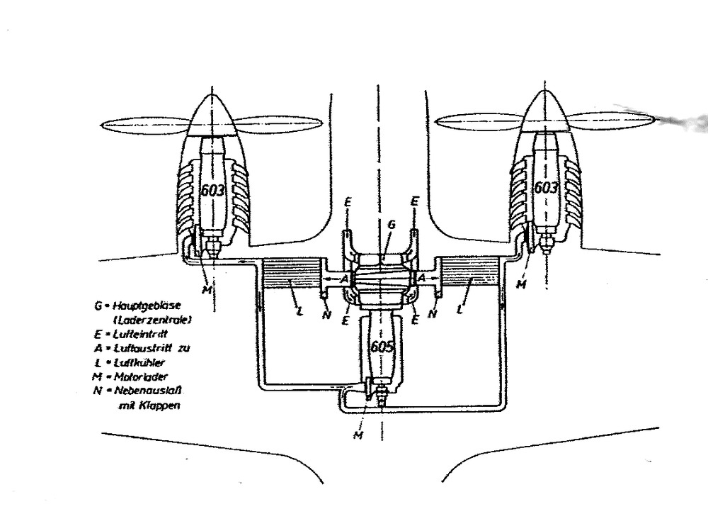 High altitude reconnaissance/bomber version with two DB 603B engines supercharged by a single Daimler-Benz DB 605T engine, in a so-called Hohen-Zentrale Anlage (HZ-Anlage) installation in the central fuselage, as one example of the Henschel Hs 130E had been fitted with, solely for powering a shaft-driven centrifugal supercharger. Three prototypes, plus three pre-production Do 217P-0 aircraft, armed with six MG 81s. Ceiling of 16,200 metres (53,100 ft).”