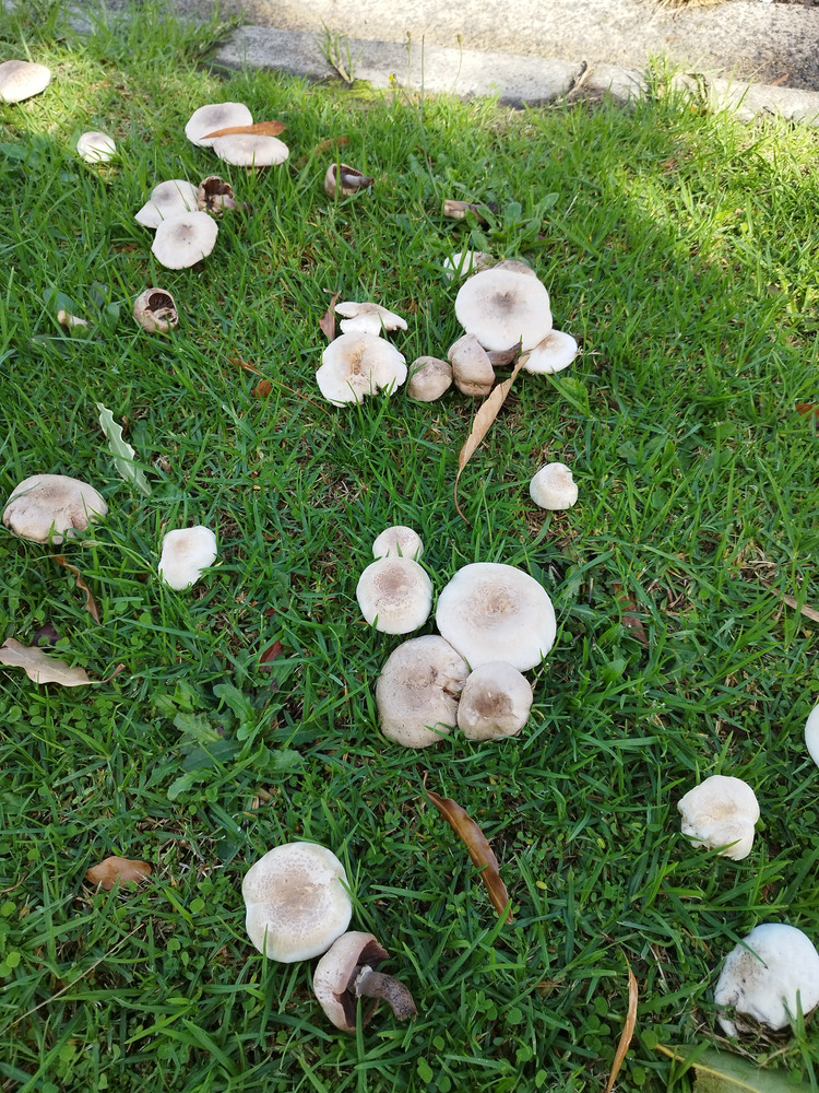 Growing prolifically at the moment in Melbourne suburbs. It’s not one I know. Basically white cap starts off round but flattens as the stalk grows longer. Gills start off light brown darkening to black as it grows. Has a skirt.