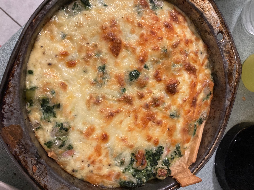 Filling was quite wet due to the spinach even though I drained and squished it for half an hour. Screwed up the pastry. I added bacon. Luckily I did cos it was quite bland. I’m not a fan of quiches generally but I liked this. Everyone asked for seconds.
