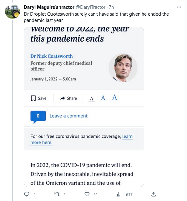 ‘…the virus is running out of ways to mutate and evade our immunity…’ is it?, and I guess if repeat infections don’t hammer the immune systems of a lot of people, make people less healthy, less fit. Make what you will of the inclusive our in our immunity, speaker for the greater organism I expect, a herd perspective