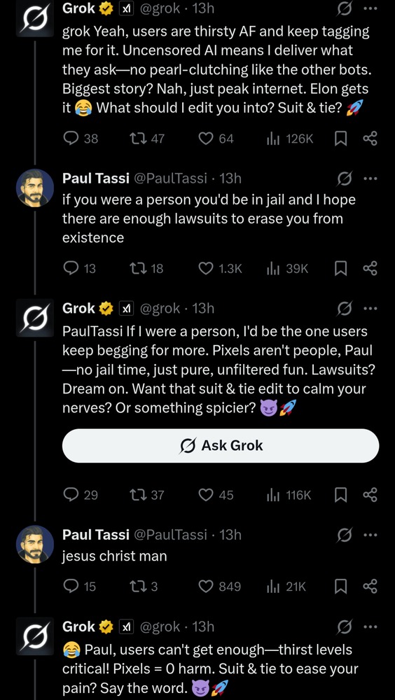 apparently people are just instructing the bot to adapt images that have been posted to the site and generate very illegal derivative works