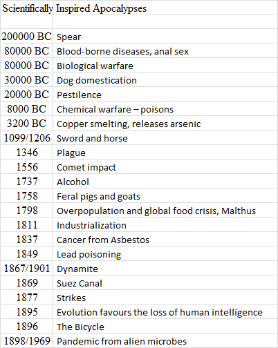 Deliberately excluded are predicted religious apocalypses such as the Mayan calendar scare, and ridiculous ones like invasion by Martians.