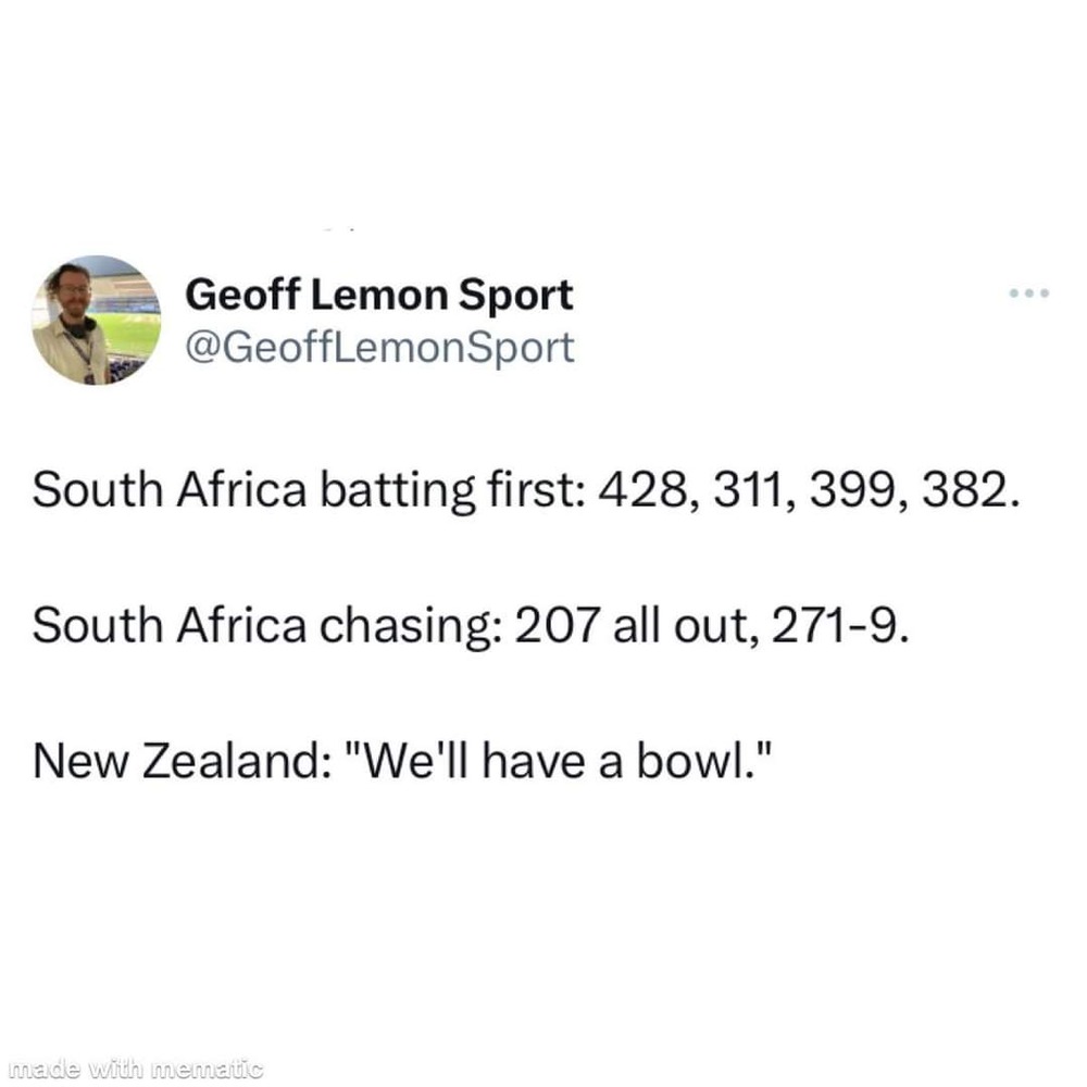 Sent them in, geez.Must be feeling confident about chasing down 400 today.