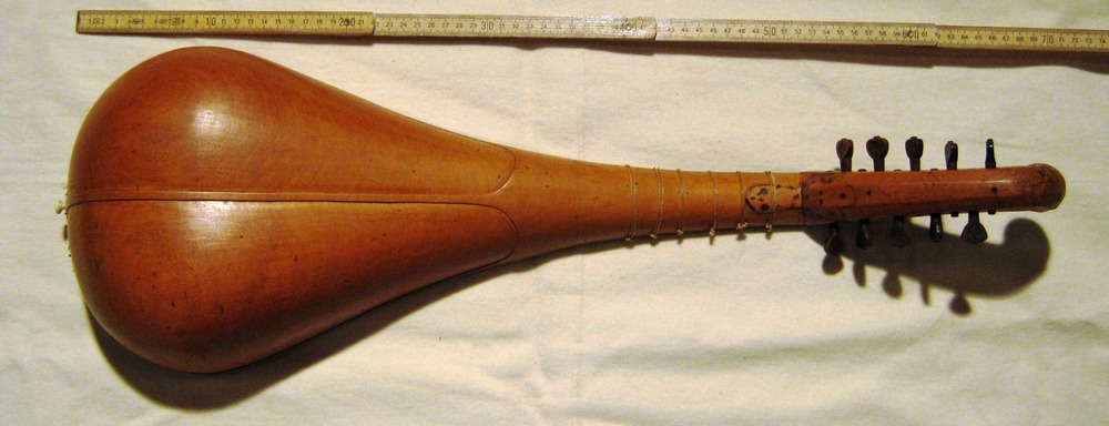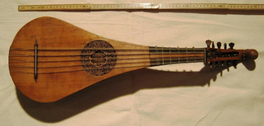 Luckily, there is a fine surviving example, the Wartburg gittern made by luthier Hans Ott in Nuremberg c.1450. It has a spruce top with a fancy inlaid parchment rose soundhole, and a carved maple body of somewhat phallic form.