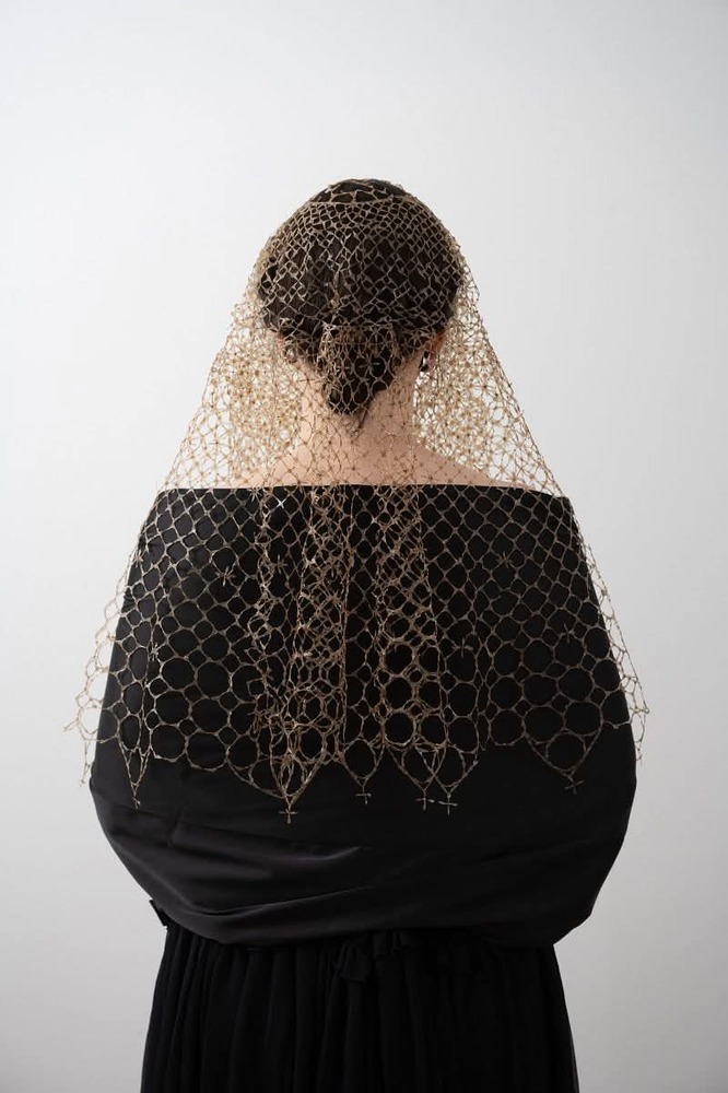 The veil acts as a poignant tribute to the staggering loss of pollinators, transforming a collective ecological tragedy into an intimate object of devotion. Through the golden luster of the silk and the translucent geometry of the wings, Jockel weaves a narrative of interconnectedness.