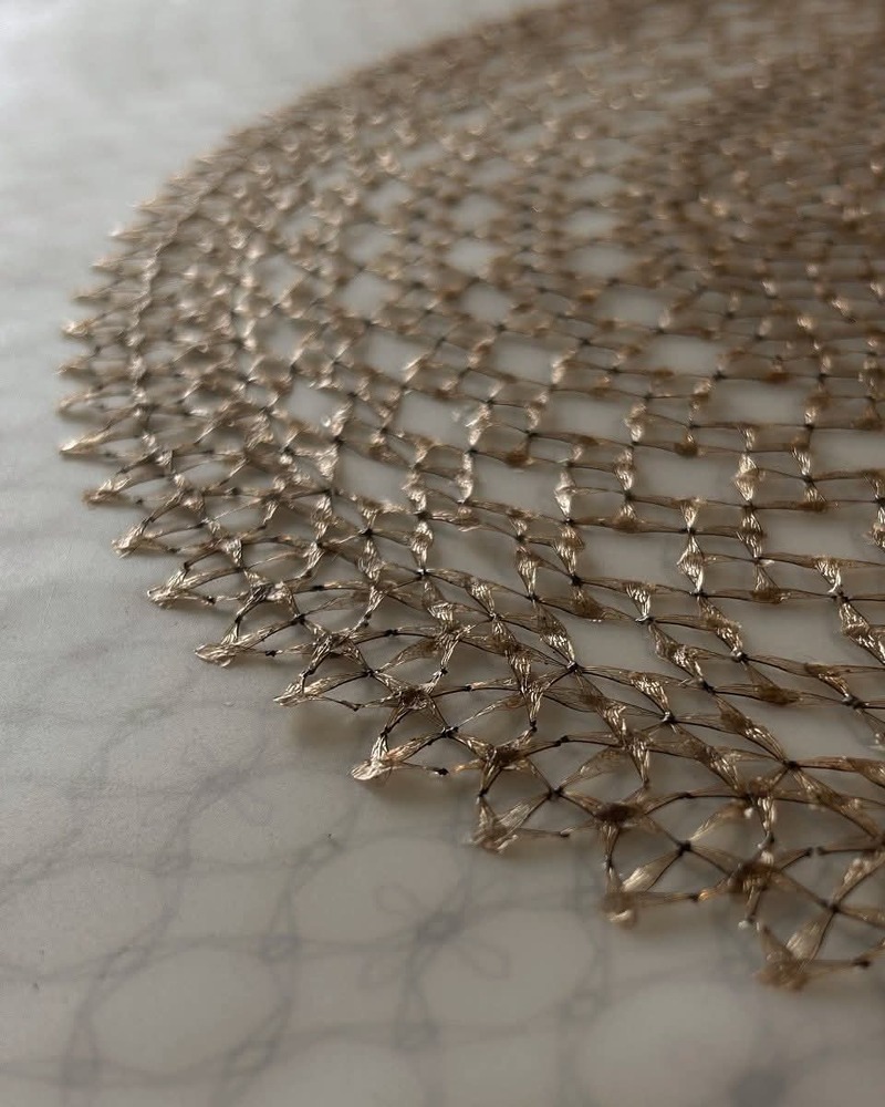 From Mira Gupta’s Facebook page…Luci Jockel’s Gold Veil is a hauntingly beautiful exploration of the delicate threshold between life and death. A master of “memento mori” in contemporary jewelry, Jockel meticulously constructs this piece using honeybee wings, intricately stitched together with gold thread. By elevating biological remains—often viewed as mere detritus—into a shimmering, ethereal shroud, she challenges our perceptions of value and fragility.