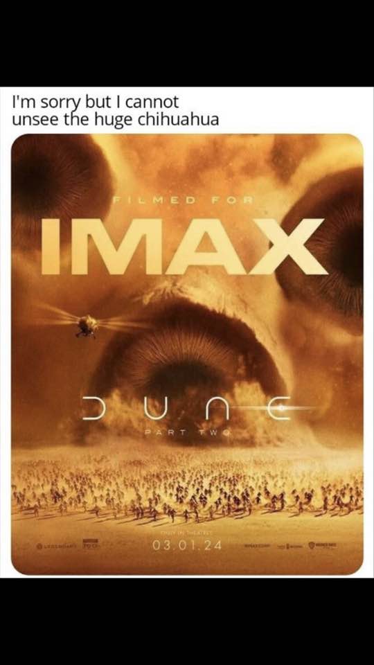 Witty Rejoinder said:Cymek said:I read Dune in the last few years and was underwhelmed.Did you like the David Lynch directed one’Dune’ has already been remade and was popular with critics and audiences. Can’t wait for ‘Part Two’ which I’m seeing at the IMAX in Melbourne in a couple of weeks.
