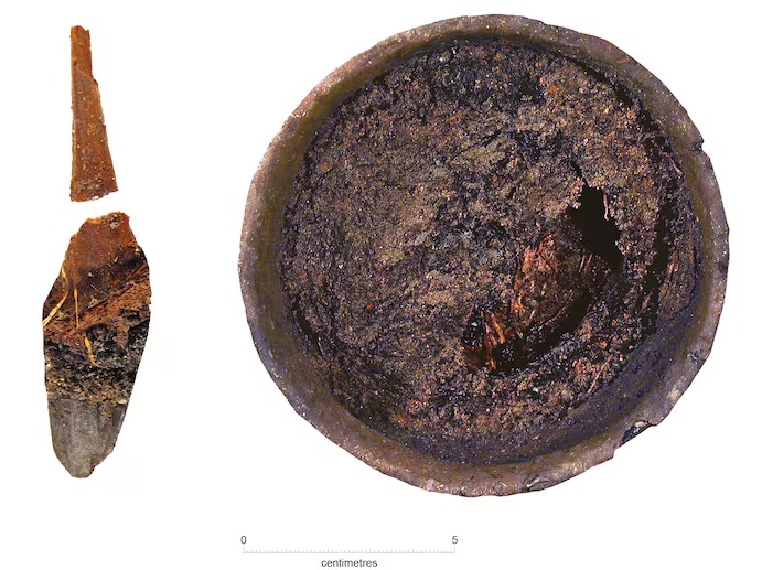 A pottery bowl with the finger marks of its maker in the clay was also unearthed, researchers said, still containing its final meal — “a wheat-grain porridge mixed with animal fats” — with a wooden spatula resting inside the bowl.