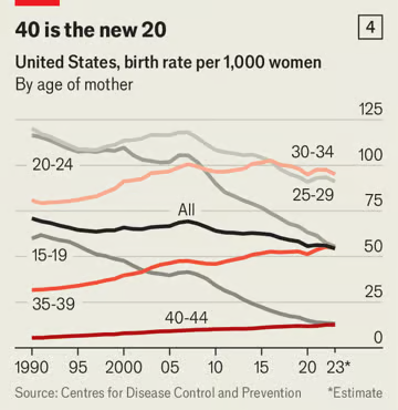 Yet the reality of the fall in fertility rates is more complex. For the most part, it does not reflect changing habits among professionals, as Becker’s theories would suggest. Instead, birth rates have collapsed because young women are not having as many children. In 1960 American women had on average 3.6 children. In 2023 they had 1.6. Remarkably, women aged 30 and above are having more children. It is only younger women who are having fewer (see chart 4).