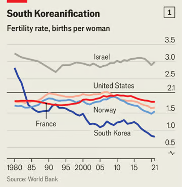 What began in East Asia is increasingly true elsewhere, too. The world faces a shortage of babies. Among rich countries, only Israel is having enough children to stop its population from shrinking, and in most places birth rates are falling (see charts 1 and 2). As a consequence, the great and the good are growing worried. “A nation’s strength”, warns Emmanuel Macron, France’s president, “lies in its ability to generate a dynamic birth rate.” Elon Musk, owner of Tesla and X, predicts the end of civilisation.