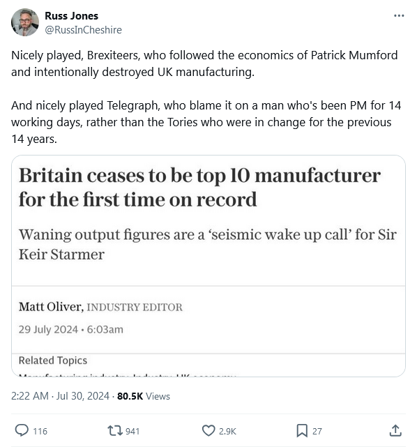 “It is also heartening to listen to Elon speak about UK politics with such deep care. He regards the mother country of the English-speaking world as being in very deep trouble.