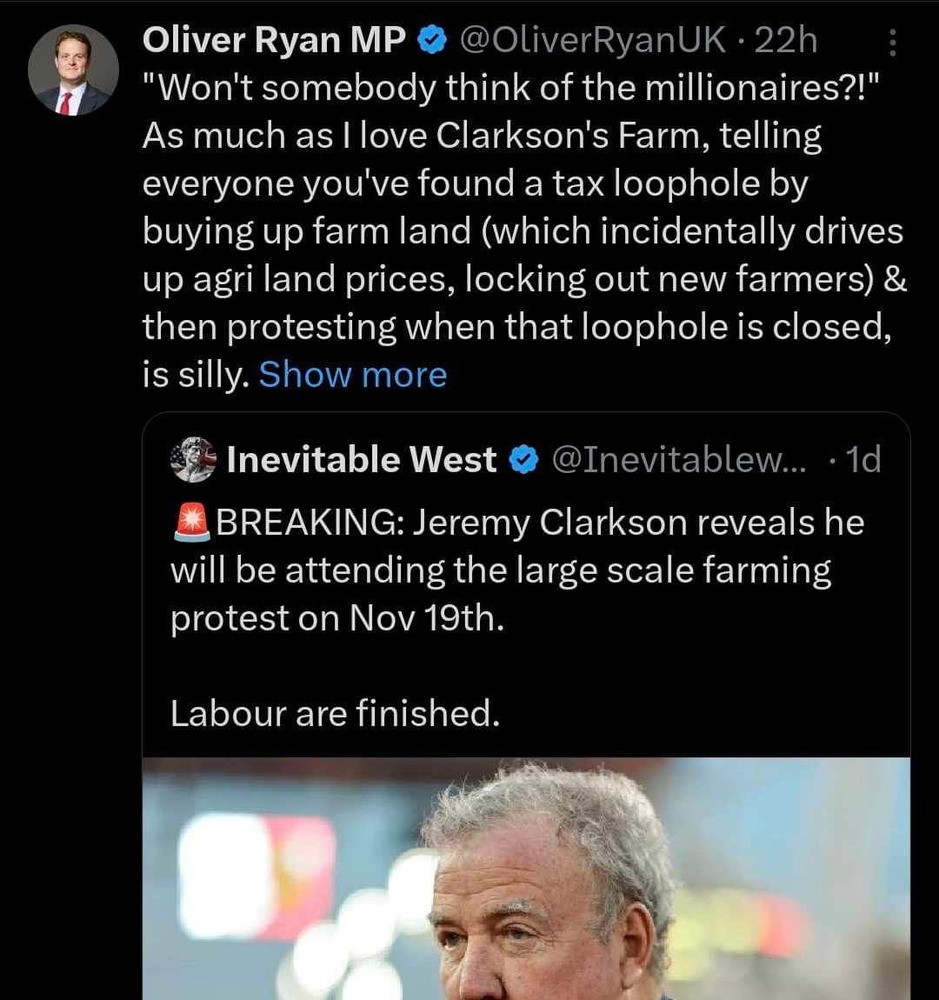 Clarkson, who has reinvented himself as a farmer, turned up to the recent London protests and became angry when Victoria Derbyshire quizzed him about his motivations for opposing the changes in the tax rules, suggesting that he’d only ever bought his farm to avoid inheritance tax. “Typical BBC,” harrumphed Clarkson, explaining that he had actually bought the farm because he wanted to shoot. That will come as a surprise to readers of Hello! Back in 2021, Clarkson told the magazine: “I’ve actually lived on the farm for many years, we had it for all sorts of inheritance tax reasons.” And in 2010 Clarkson also discussed his reasons for buying the farm, saying: “I have bought a farm. There are many sensible reasons for this. Land is a better investment than any bank can offer. The government doesn’t get any of my money when I die.” Clarkson, who left Top Gear after punching and verbally abusing a producer who dared to tell him there was no hot food available at their hotel, famously once wrote of Meghan, Duchess of Sussex that “I hate her,” and that he dreamed of the day “when she is made to parade naked through the streets of every town in Britain while the crowds chant, ‘Shame!’ and throw lumps of excrement at her”. This was too dodgy even for the Sun, which apologised.