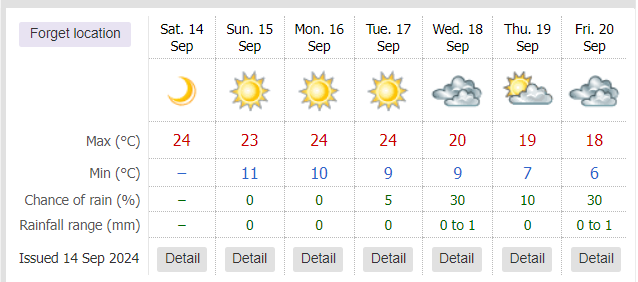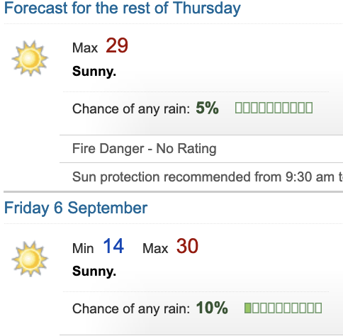 Summary Min 6 Max 22 Sunny. Chance of any rain: 5%
