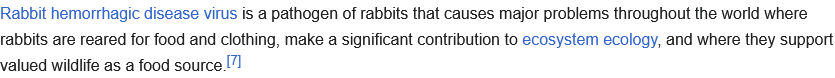 Rabbit hemorrhagic disease virus is a pathogen of rabbits that causes major problems throughout the world where rabbits are reared for food and clothing, make a significant contribution to ecosystem ecology, and where they support valued wildlife as a food source. Australia and New Zealand, in an effort to control their rabbit populations, have intentionally spread rabbit calicivirus.