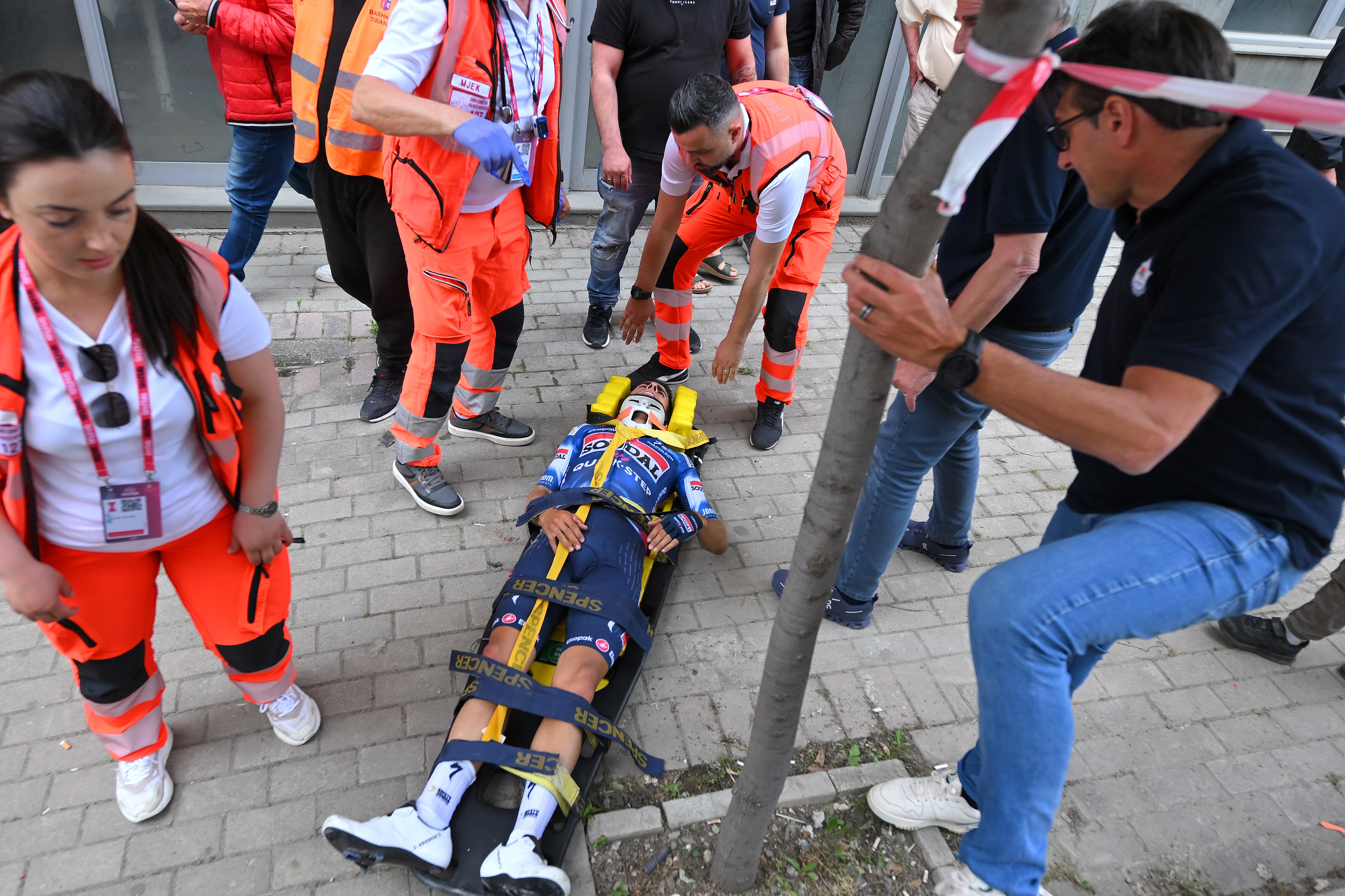 Mikel Landa broke his back in that nasty crash towards the end.https://www.abc.net.au/news/2025-05-10/giro-d-italia-crash-stage-one-mikel-landa-jay-vine/105277524