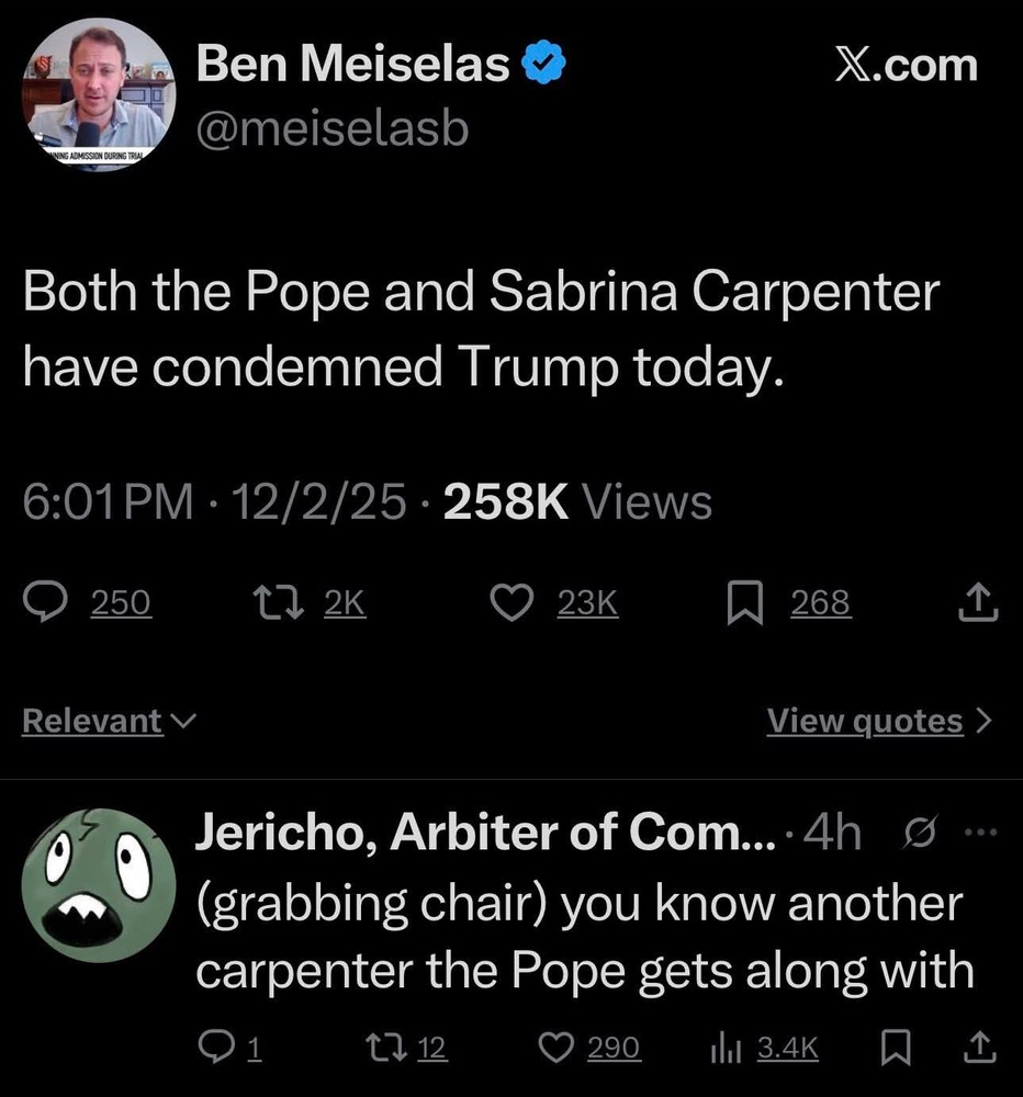 - “Which pop star carves her own wooden nativity scene? Sabrina Carpenter.”