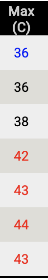 Probably about 26 – 27 here, down from 30 or so. 12 minimum overnight and a sensible 24 tomorrow.