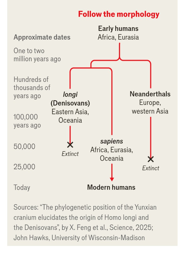 Follow the morphology instead—meaning the shape of physical features such as teeth, brain cases, foreheads and eyebrows—and an entirely different story emerges. It suggests that the ancestors of sapiens and longi (including, in Dr Ni’s and Dr Stringer’s telling, the people who would become the Denisovans) remained one group and probably lived in Europe or west Asia more than a million years ago.