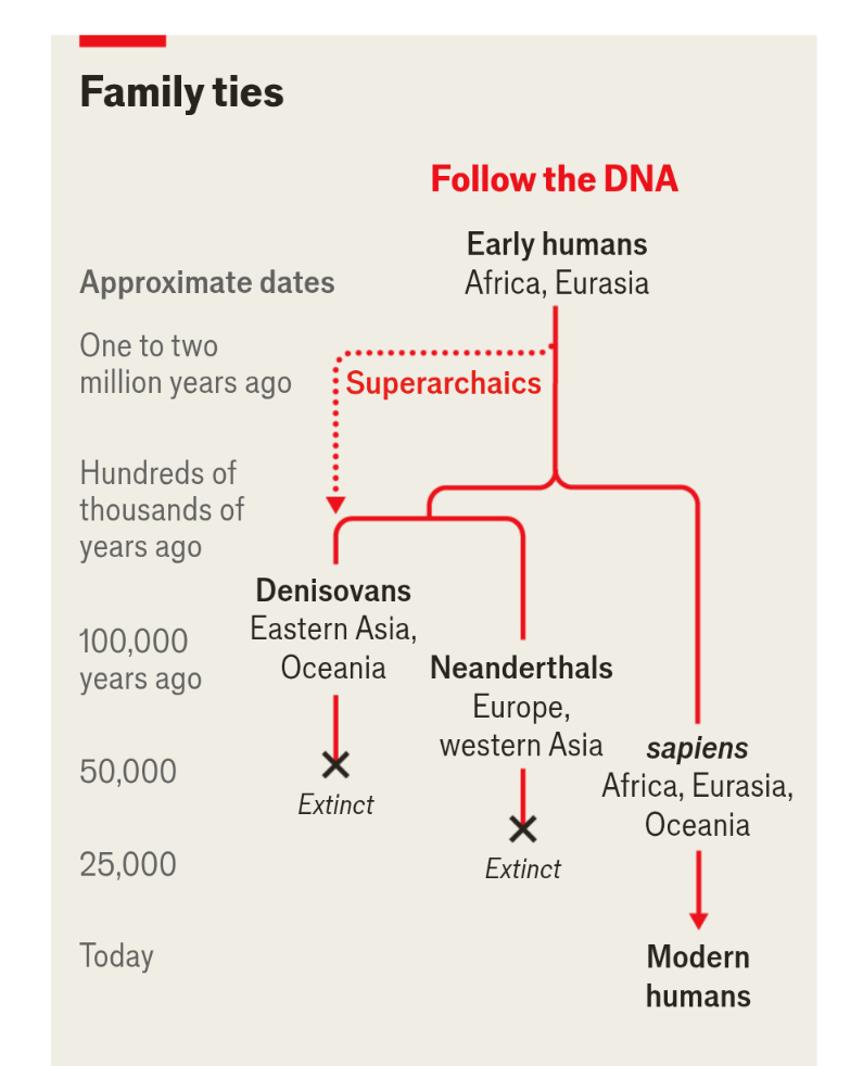 The genetics also allows for another possibility: a paper from 2020 found evidence that Denisovans interbred with a very old “superarchaic” lineage that had split from their own ancestors more than 1.2m years earlier. Alternatively, Denisovans might have retained erectus-like features while sapiens evolved differently.