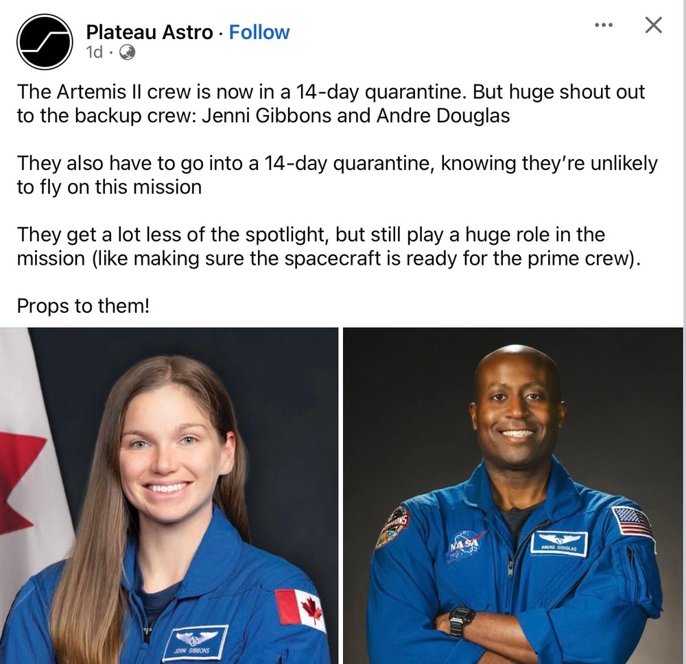 Commander Reid Wiseman, Pilot Victor Glover, and Mission Specialists Christina Koch and Jeremy Hansen will be the first people to see the lunar farside since 1972. The first three all have had several months in space. Hansen, of the Royal Canadian Air Force, has no spaceflight time. He has trained as an astronaut since 2013 and was selected to join this mission in 2023, during a more peaceful time in Canadio-Unitedstatesian relations.