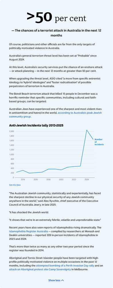 Australia’s general terrorism threat level has been set at “Probable” since August 2024. At this level, Australia’s security services put the chance of an onshore attack — or attack planning — in the next 12 months at greater than 50 per cent. When upgrading the threat level, ASIO cited “a move from specific extremist ideology to ‘hybrid’ ideologies” and “faster radicalisation” of possible perpetrators of terrorism in Australia.
