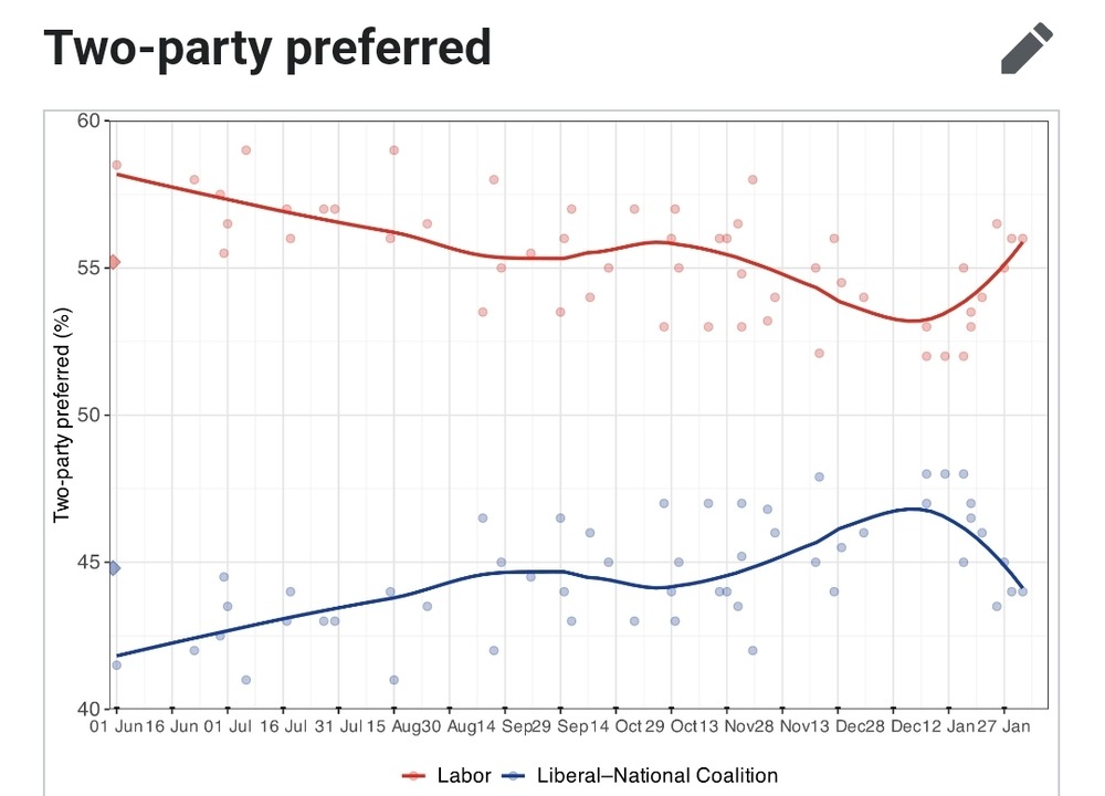 ALP 56 – LNP 44, in the two party preferred.