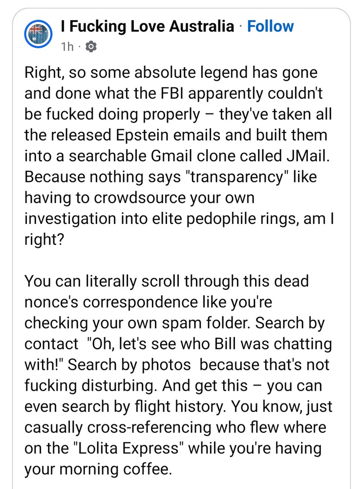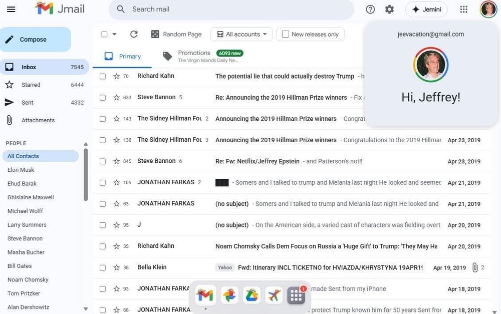 Jmail is a browser-based archive of emails and records released by the United States House Committee on Oversight and Government Reform under the Epstein Files Transparency Act (EFTA). The website is stylized in a Gmail-based interface, with the goal of making EFTA releases easier to access and browse. The site is from the viewpoint of financier and sex offender Jeffrey Epstein’s personal email inbox, jeevacation@gmail.com, and contains text conversations up to 2019.