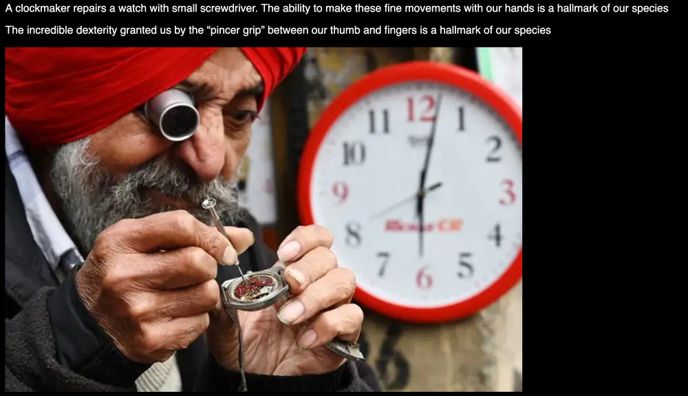 A clockmaker repairs a watch with small screwdriver. The ability to make these fine movements with our hands is a hallmark of our species