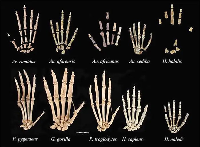 Hand skeletons of different ancient hominins, gorillas, chimpanzees and Homo sapiens