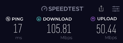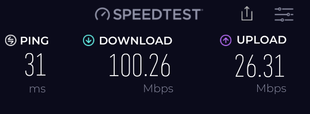 Same speed test before/after on the same laptop. $69 p/month 100Mbps down unlimited data.
