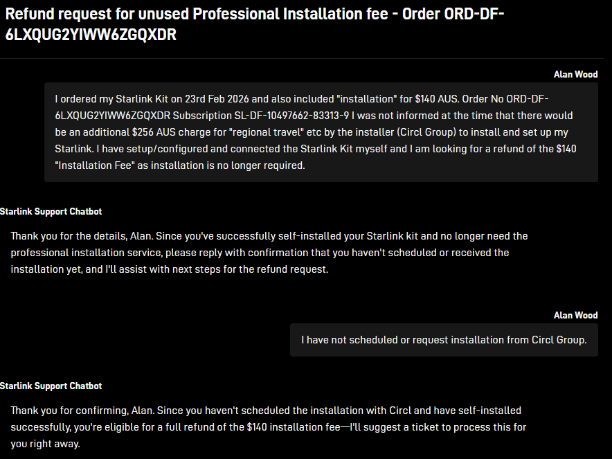 This can only be an interaction with Starlink’s AI support “chatbot”.