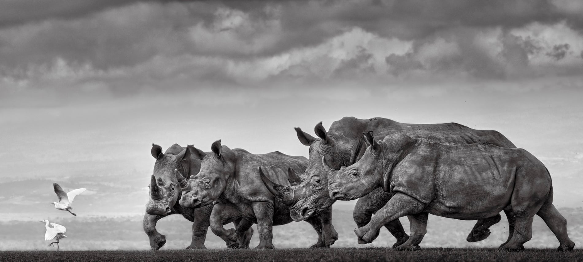 Rhinos and egrets, Solio Game Reserve, Kenya. Bronze in the Black and white category.