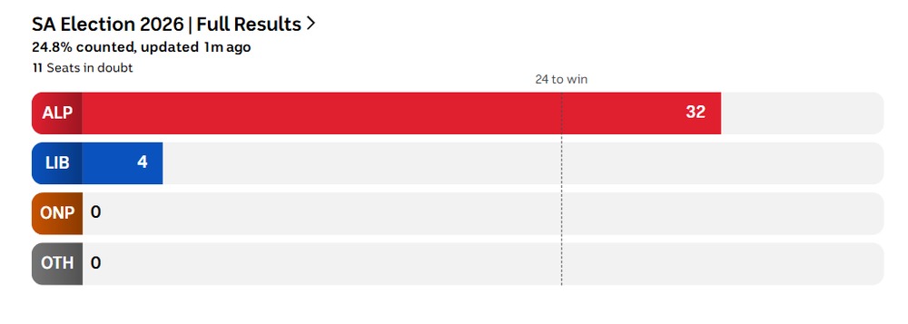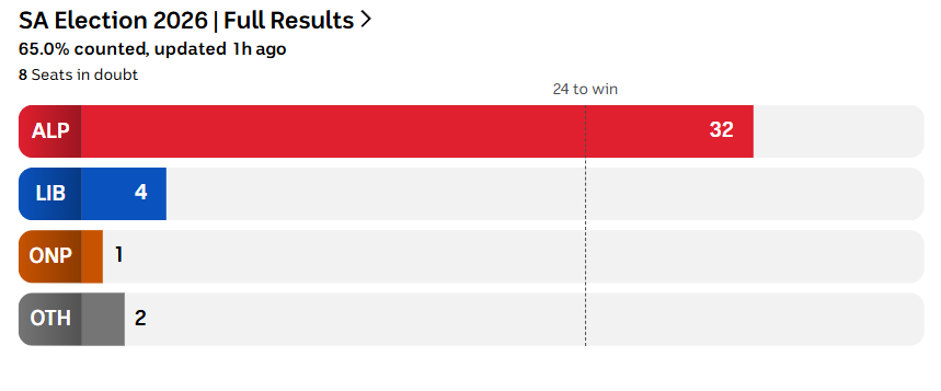 ALP and Greens combine to a majority. This is an improvement, for them, as previously the ALP needed 1 more vote, meaning they had to negotiate with the sometimes pernickity SA-Best, Xenophon’s old crew. SA-Best has been eliminated.