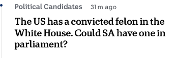Pretty clear now that the eleven Leg Council members elected will be 5 ALP, 3 ONP, 2 Lib, 1 Green. The total LC then, combined with those elected in 2022, will be 10 ALP, 6 Lib, 3 ONP, 2 Green, 1 Sarah Game (former ONP).