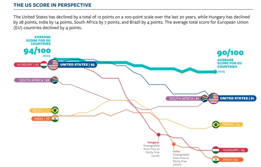 2025 was another rough year for rights lovers, with more countries getting worse than better. Among the countries still rated “Free”, the three biggest drops were in Bulgaria, Italy and the United States.