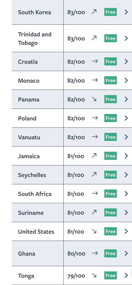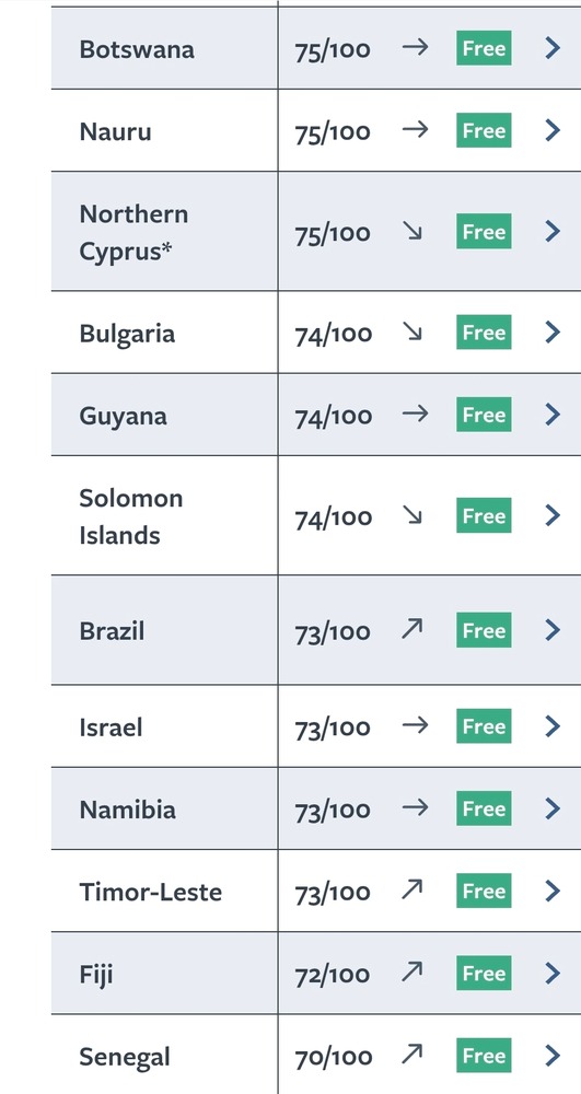 The score is composed of 32/40 for Political Rights and 49/60 for Civil Liberties. This puts in the same realm as Ghana (80), Vanuata (82) or South Africa (81): multiparty democracies but with curtailments of civil liberties.