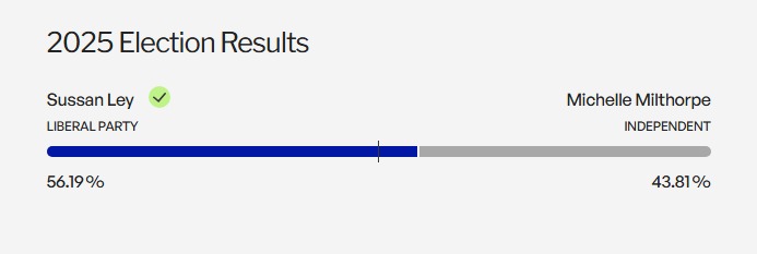 Farley’s main challenger for the seat is Climate 200-backed community independent Michelle Milthorpe, who whittled Ley’s lead down to just 6.2 per cent at last May’s federal election. She has fought hard against claims that she’s beholden to Climate 200, arguing that only 2 per cent of donations made to her campaign came from the funding vehicle.