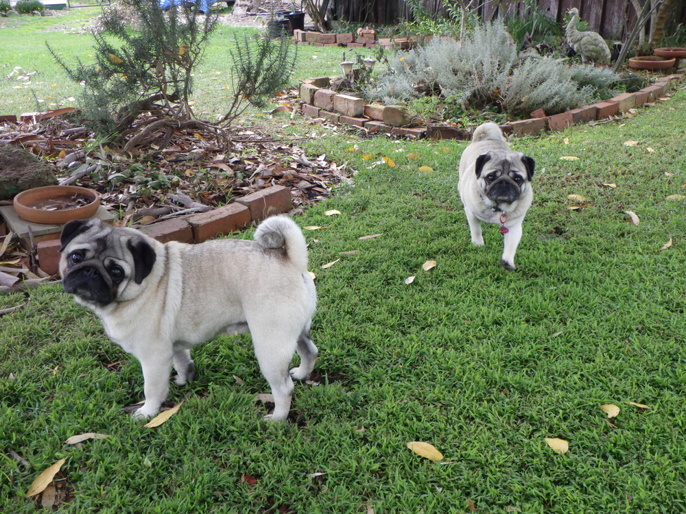 I don’t let dogs lick my face/head. This morning the visiting Pugs felt it necessary to lick my feet. I coped with that OK. We have now walked them. It’s a lot more structured when we walk them than when my brother walks them. They are both on fixed length leads and before long they will know how to heel properly and to sit at roadsides. He’s got an extendable lead for Tully and he lets Reuben off. I would not ever do that. He lives in Ivanhoe in Melbourne. I told him while they are with us, they comply with our rules…if you are off-property, you are on-lead. Far too many trucks around here. There’s half an acre for free running in the backyard.