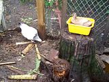 I yelled for the plastic lawn rake to give the cat a good scare…… after a tussle….. the cat was underneath the chook house…….elf got the hose…..