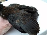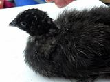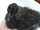 Mumchook Lin Lin has been moved to the temp caged area under the almond tree, and both her chick and her adopted black chick are snug under her wing. It’s so adorable to see her mothering the adopted d’uccle :)