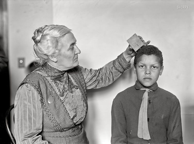 My guess is, she’s practicing the pseudoscience of phrenology, which is odd for a “doctor” of her time since the practice had been pretty much discredited well before the end of the 19th century. Of course, she might also be a schoolmarm making sure the subject’s hair fell within accepted limits.