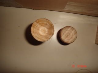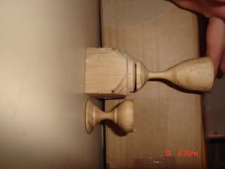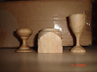 the peace of timber in the middel on the thrid picture is the off the tall one it did start off as a square bit of timber and i made it round and then got the timber out of the hole as you can see in photo 2 and the square bit of timber which has the tall egg cup sitting on it was where the cup part came off, which is in photo 1.