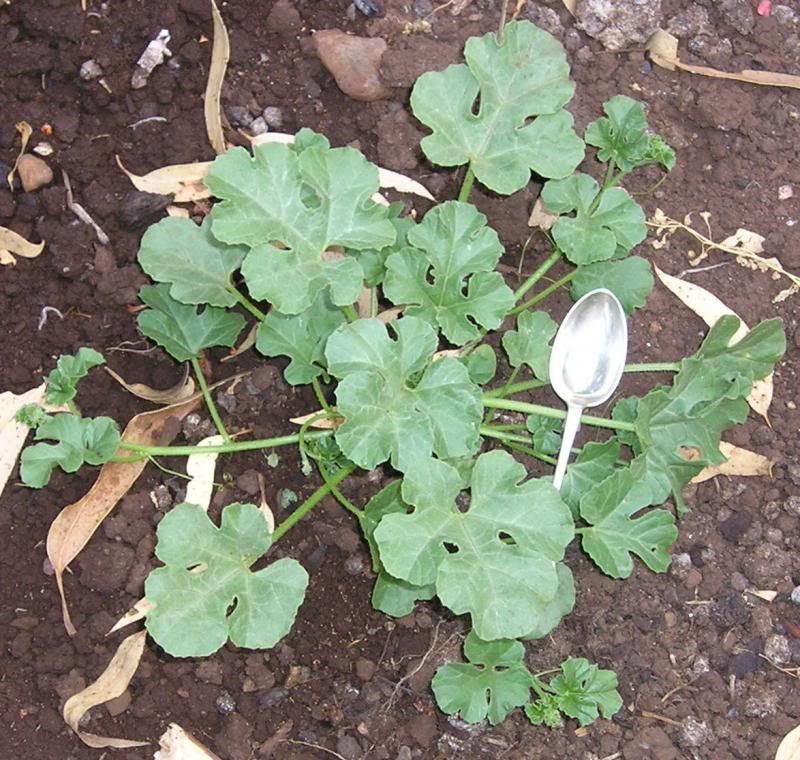 pinch a leaf and if it is smelly it is a paddy melon. Otherwise it is a watermelon.Annual prostrate vine, with slender rough stems to 1.6 m long with undivided tendrils. Leaves alternate, ovate-cordate, 3-6 cm long, almost hairless above, rough and hairy below, divided into five obovate toothed main lobes, the middle the longest and often further divided into three lobes, the stalk as long as the blade. Flowers yellow small about 6 mm across. Cucumis myriocarpus