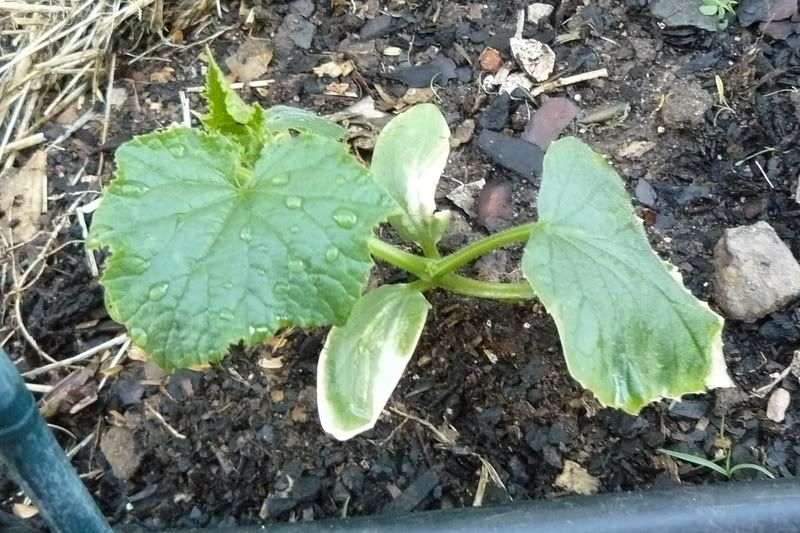 - Three cucumbers (maybe some of them are doubles). Couple have their first set of true leaves