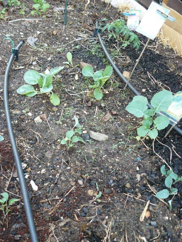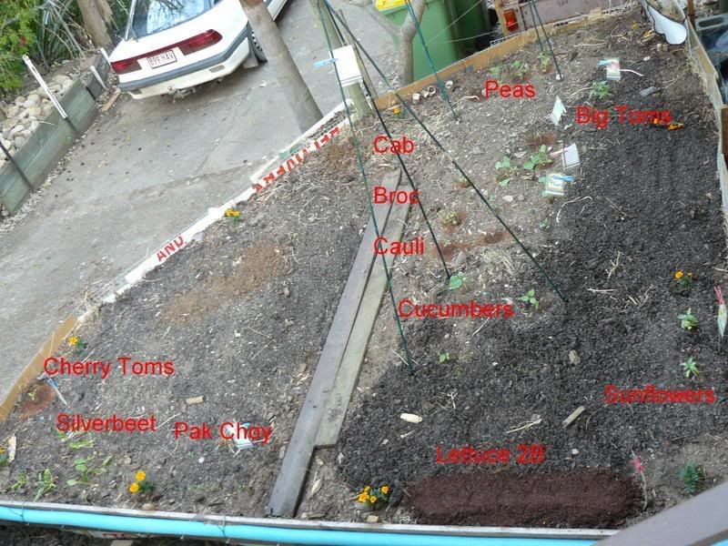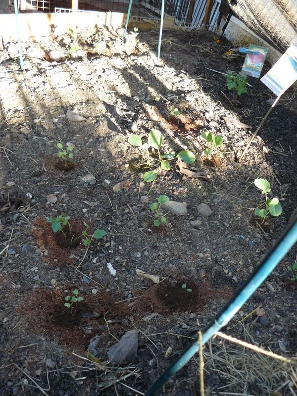 - two batches of cabbages, cauli, broccoli planted out. We’ll see how they go when it gets hotter. I’ve planted the cucumbers between them and the summer afternoon sun. I was also thinking maybe I could put a shadecloth clothe over them come Sept/Oct
