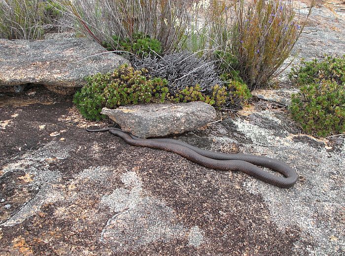 Here are a couple of very fast moving Dugites (a WA Brown Snake), sunning themselves next to their holes on a large remote granite outcrop in the mallee. This rocky outcrop has hundreds of Dragon Lizards (to around 6” in length) scurrying out of your way as you walk around, they are literally everywhere, except for one portion where there was not a single one over a good 100 metre length. However, instead of lizards in this part of the rock, it had at least two Dugites. The lizards obviously knew about them and kept well away. That is what you call respect, although they probably also shed their skin when suddenly confronted by one!
