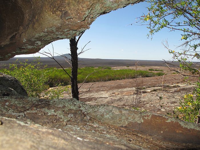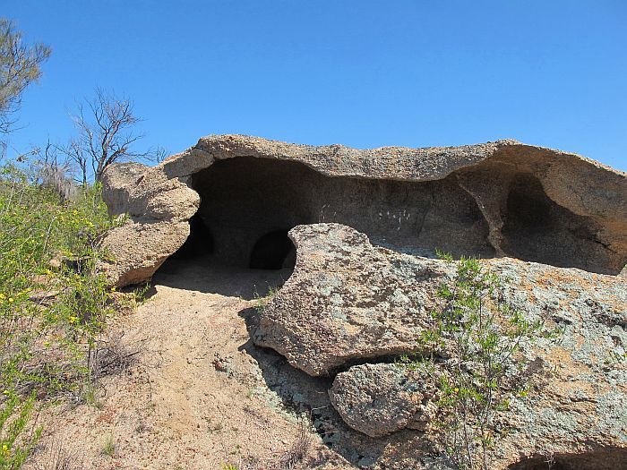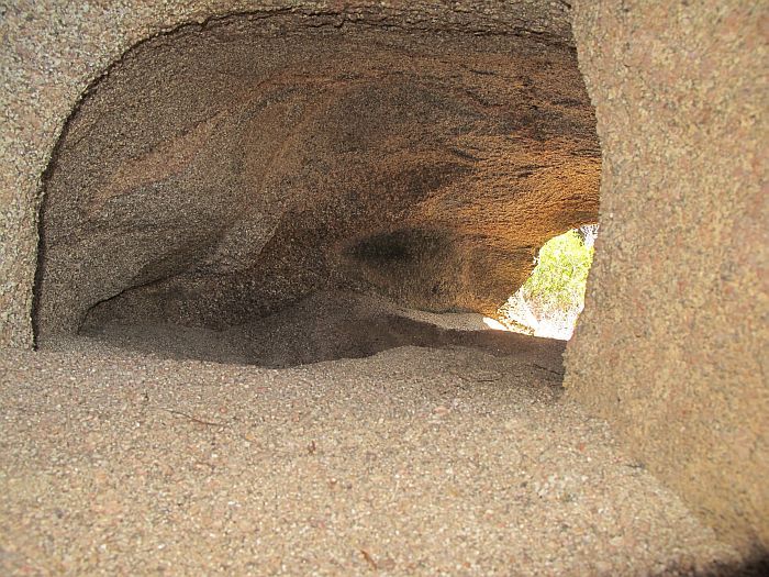 The rock is around 1 km each way with two peaks separated by a deep gully. On the far side that can only be reached on foot (although very few people ever visit this area), there are three large rocks (car size) with smooth holes tunnelled out by the wind. These holes are just the right size for a Dingo to enter and camp there; both have a soft sandy base. The one above had another similar chamber branching off to the left and both had obviously been used recently.