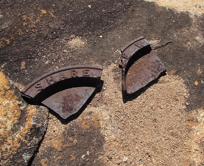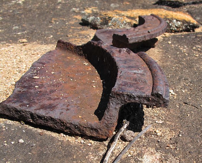 On the same rock, but on the outer lower apron I happened upon the two pieces of iron, which I presume were brought to the area by aborigines, possibly to make axes. There is absolutely no sign of any settlement in the area, so they had been carried some distance, probably from the goldfields. Any ideas what machinery they are off and their age?